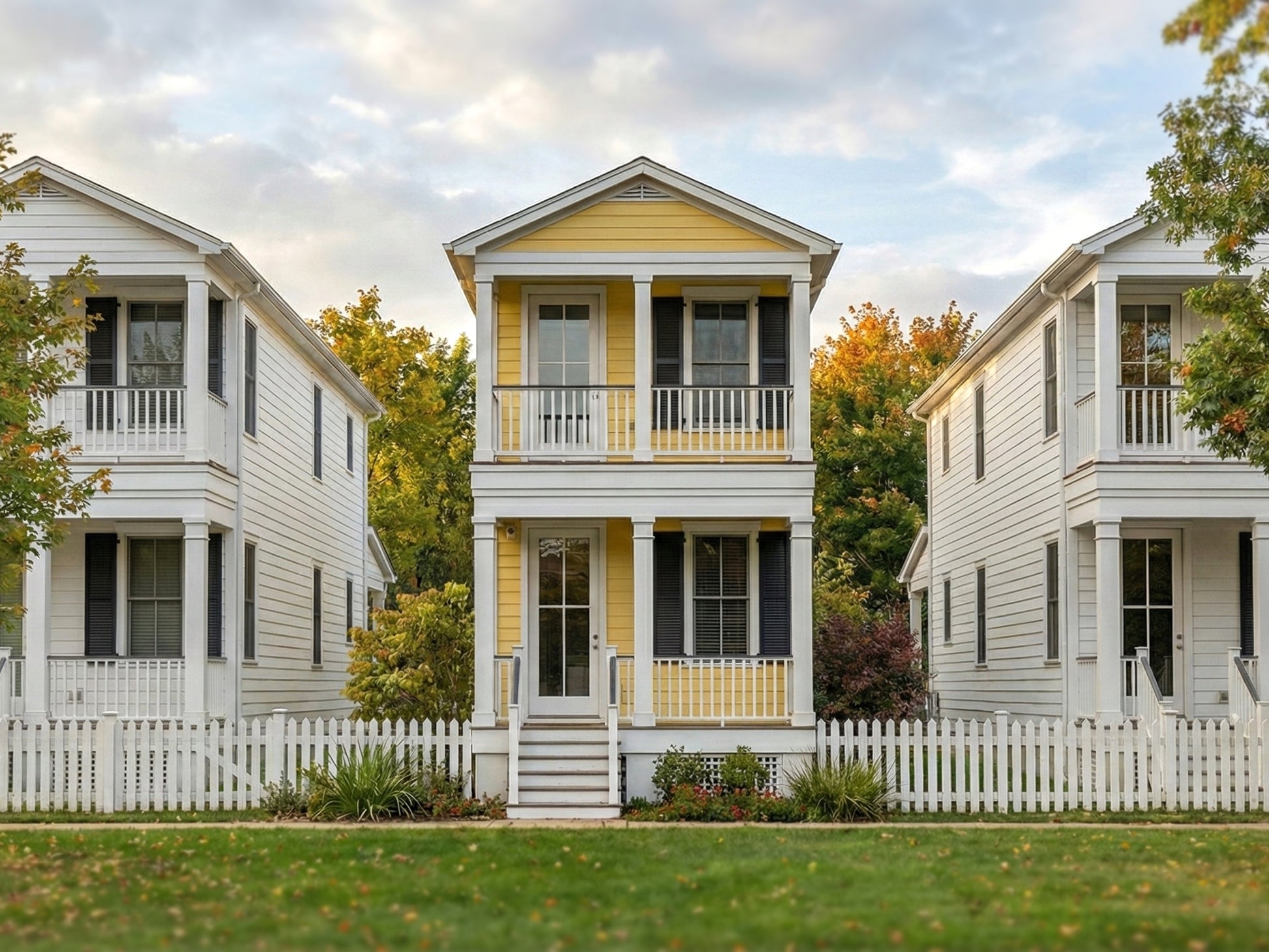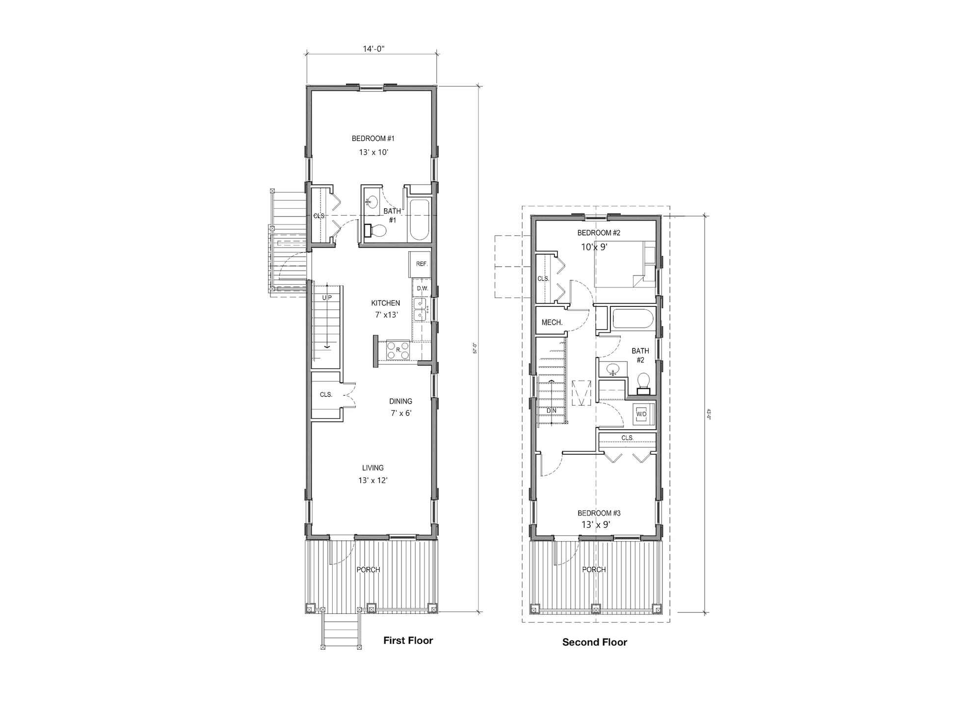 This slender, three-bedroom house includes five different facades in one plan set. It's ideal for narrow lots and for homebuilders who wish to build a row of double-height porches with "presence" on the street.