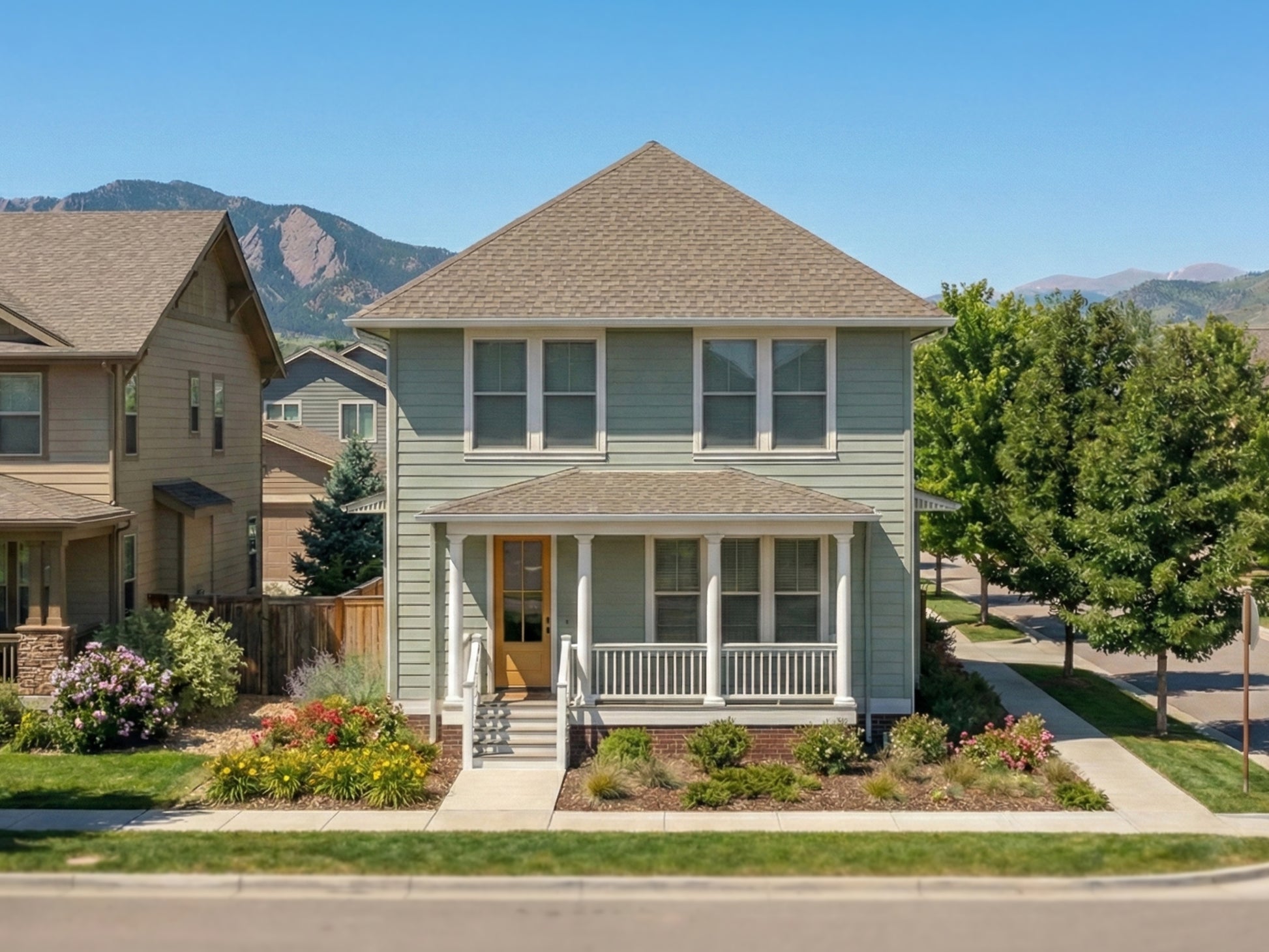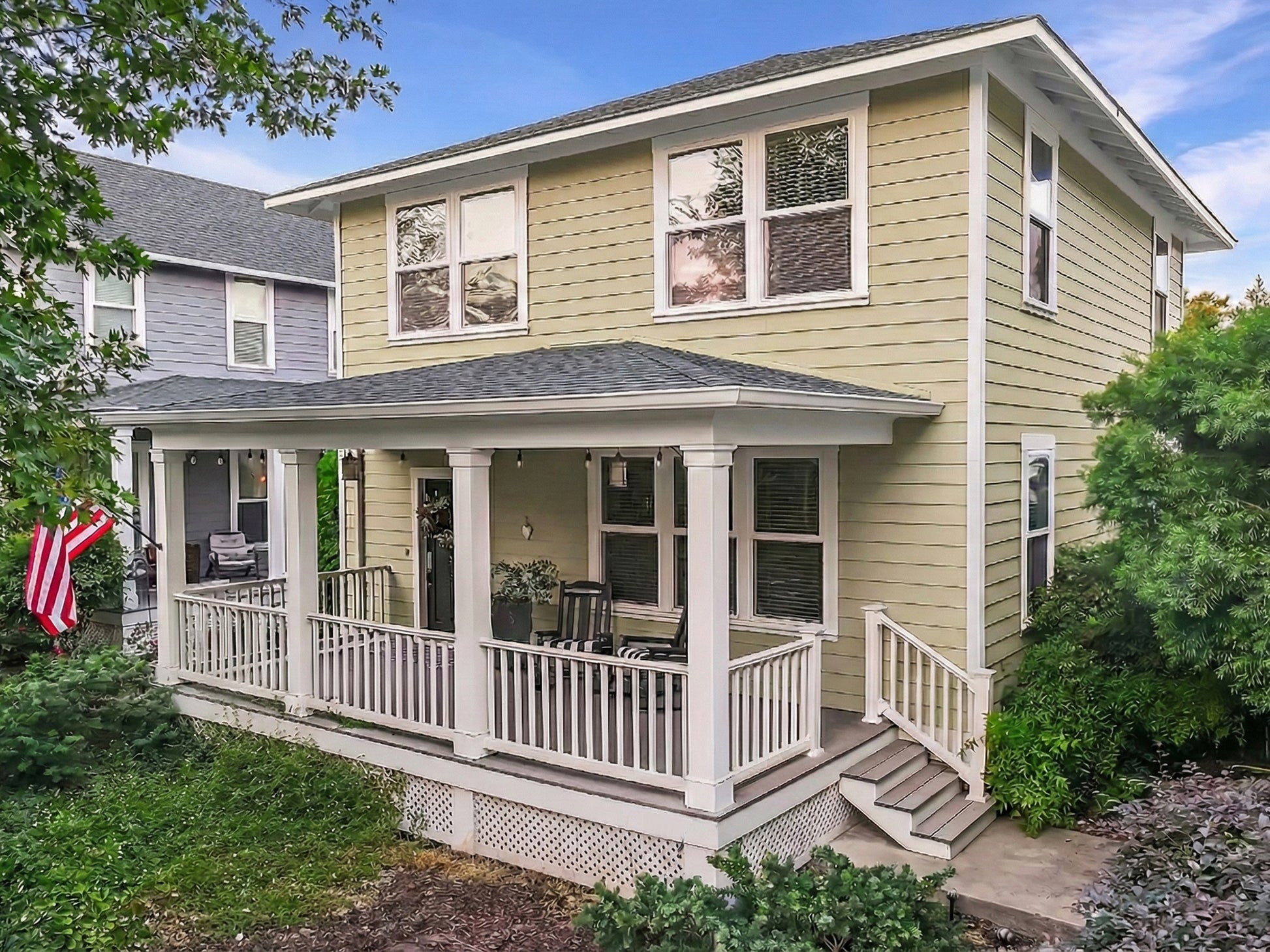 A thoughtful update on traditional Foursquare design. Three bedrooms, two baths upstairs and a half bath down. Open-plan kitchen and dining. Front porch and rear porch for private dining and neighborly visits.