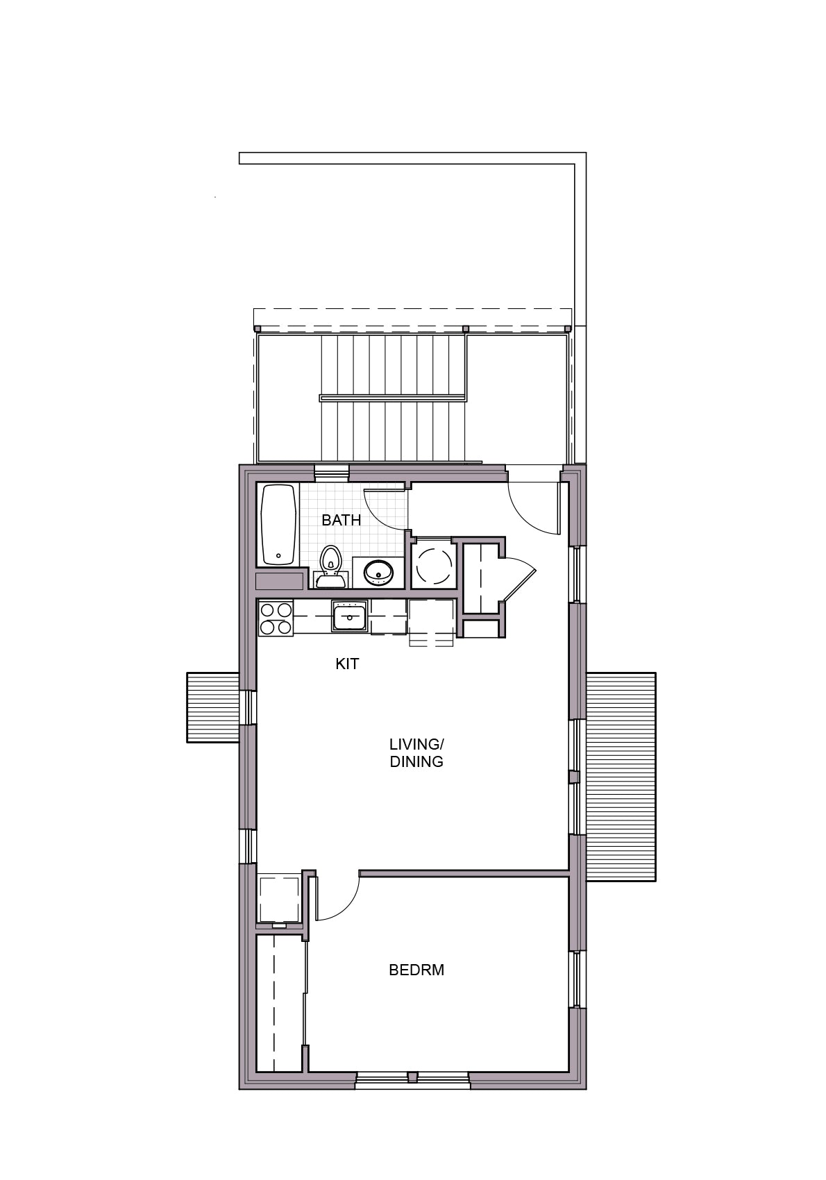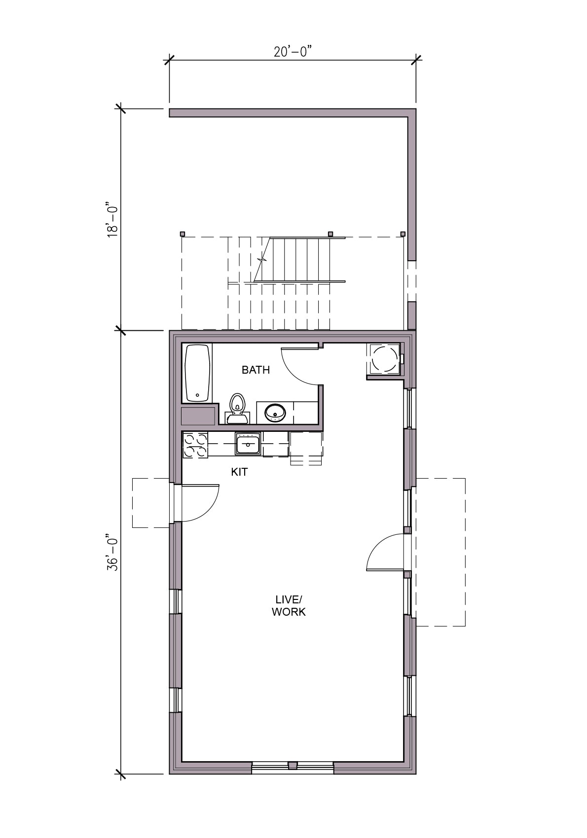 Office below, apartment above. This classic arrangement gets a dignified treatment in the Uptown live-work. A simple form and harmonious facades make it the ideal utility player for corner lots.