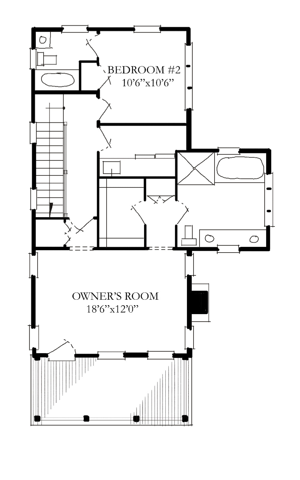A two-bedroom home with open living area and extra comforts: spacious primary suite, double-height front porch, fireplace, and a rear porch with closet for storing outdoor gear.